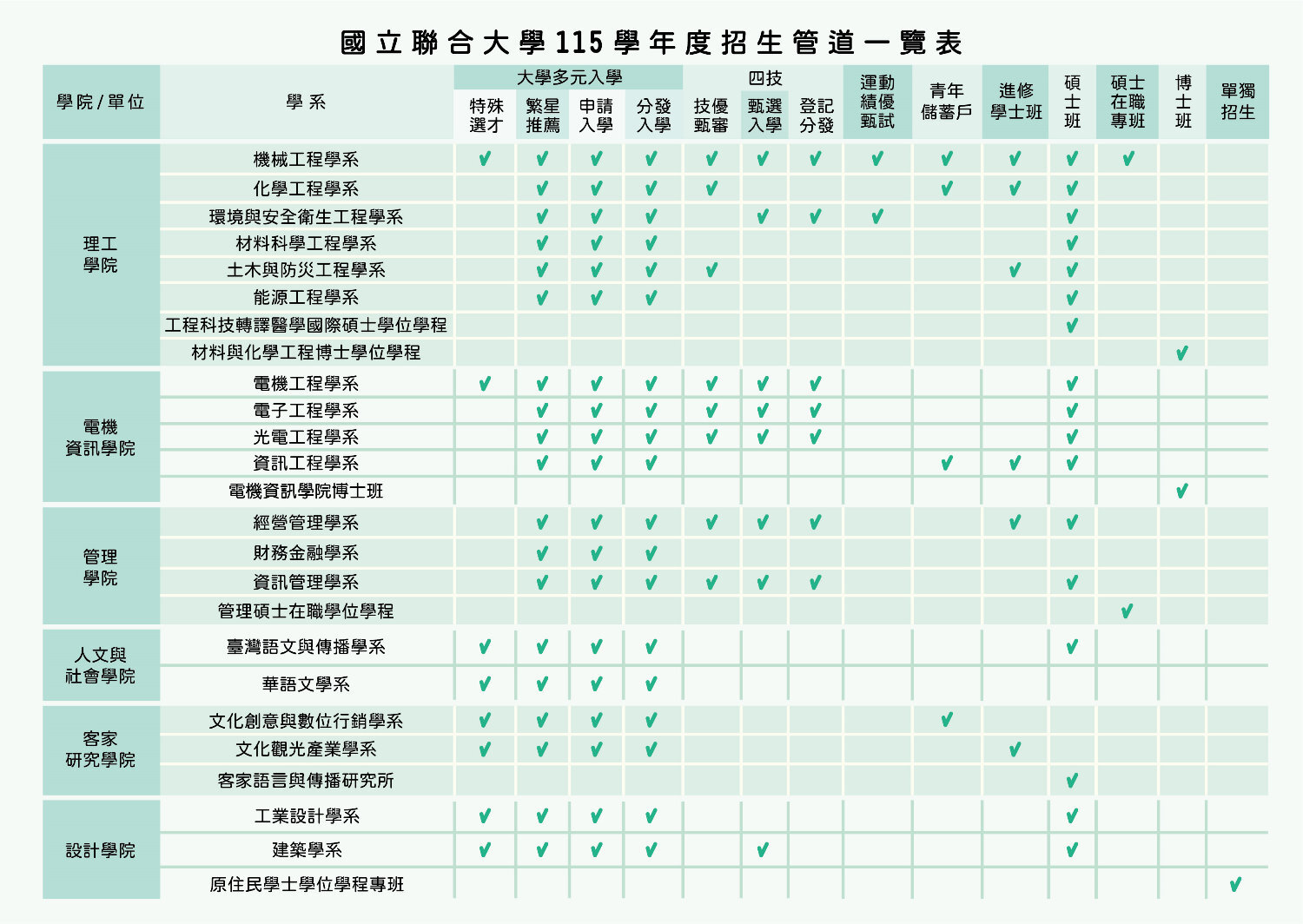 國立聯合大學115學年度招生管道一覽表